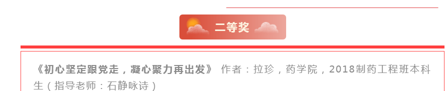 根据湖南省教育厅《关于组织开展“庆祝建党100周年,永远跟党走”主题征文活动的通知》要求,公司在校开展了征文评选活动。全校师生踊跃参与,活动共有17个公司参与,征集文章共62篇。经过专家严格评审,最终评选出:一等奖5名(研究生1名,本科生3名,预科生1名),二等奖10名(本科生7名,预科生3名),三等奖20名(本科生17名,预科生3名),优秀指导老师5名。公司2018级制药工程班拉珍同学荣获二等奖。