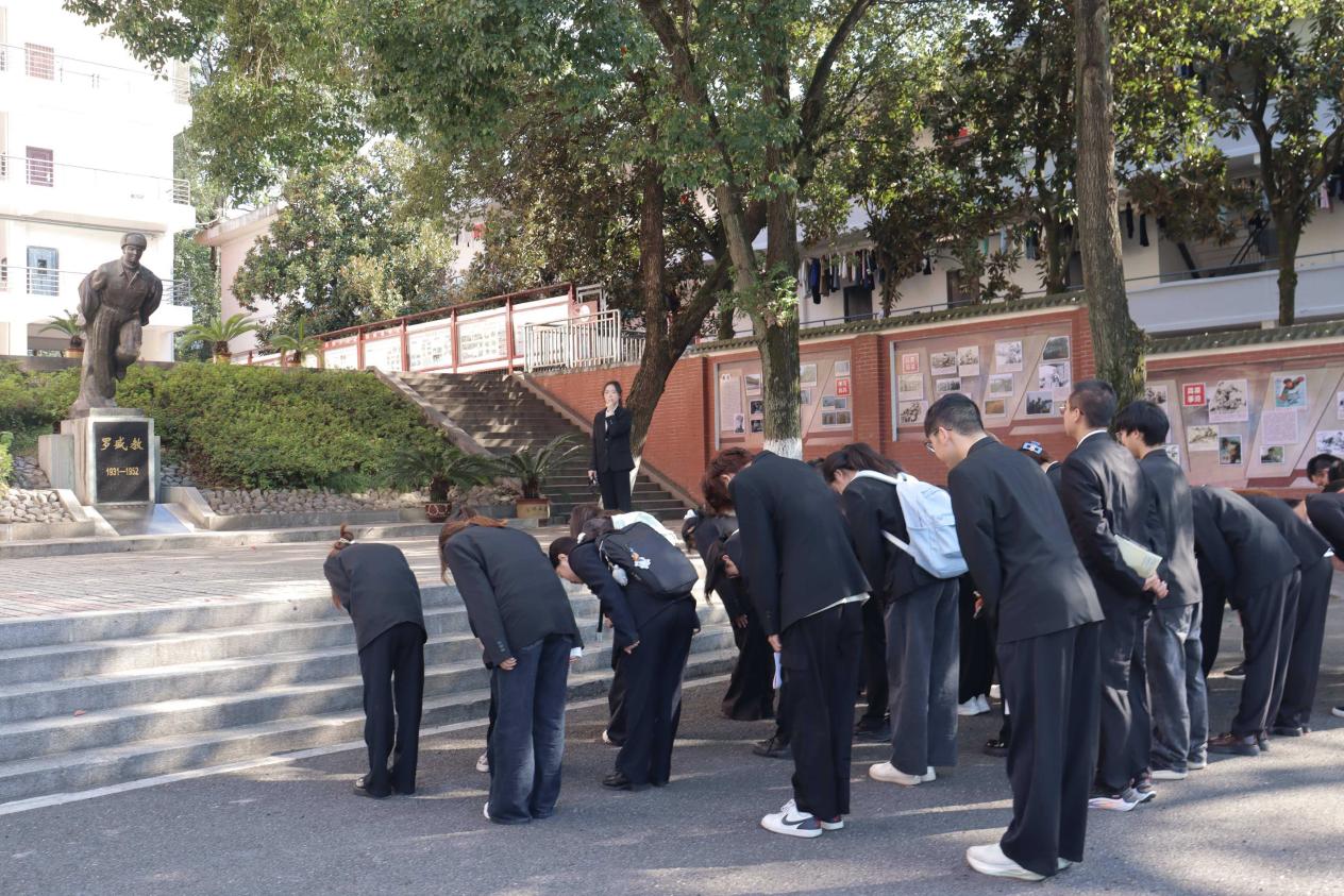在罗盛教烈士雕像处,全体成员聆听英雄事迹,鞠躬致敬,深刻感悟其舍己为人的奉献精神。