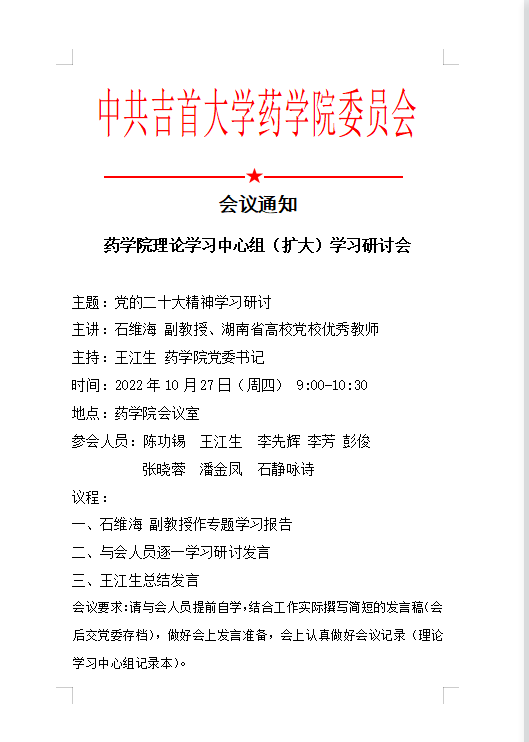 伟德中国官网入口理论学习中心组(扩大)学习研讨会通知--党的二十大精神学习研讨