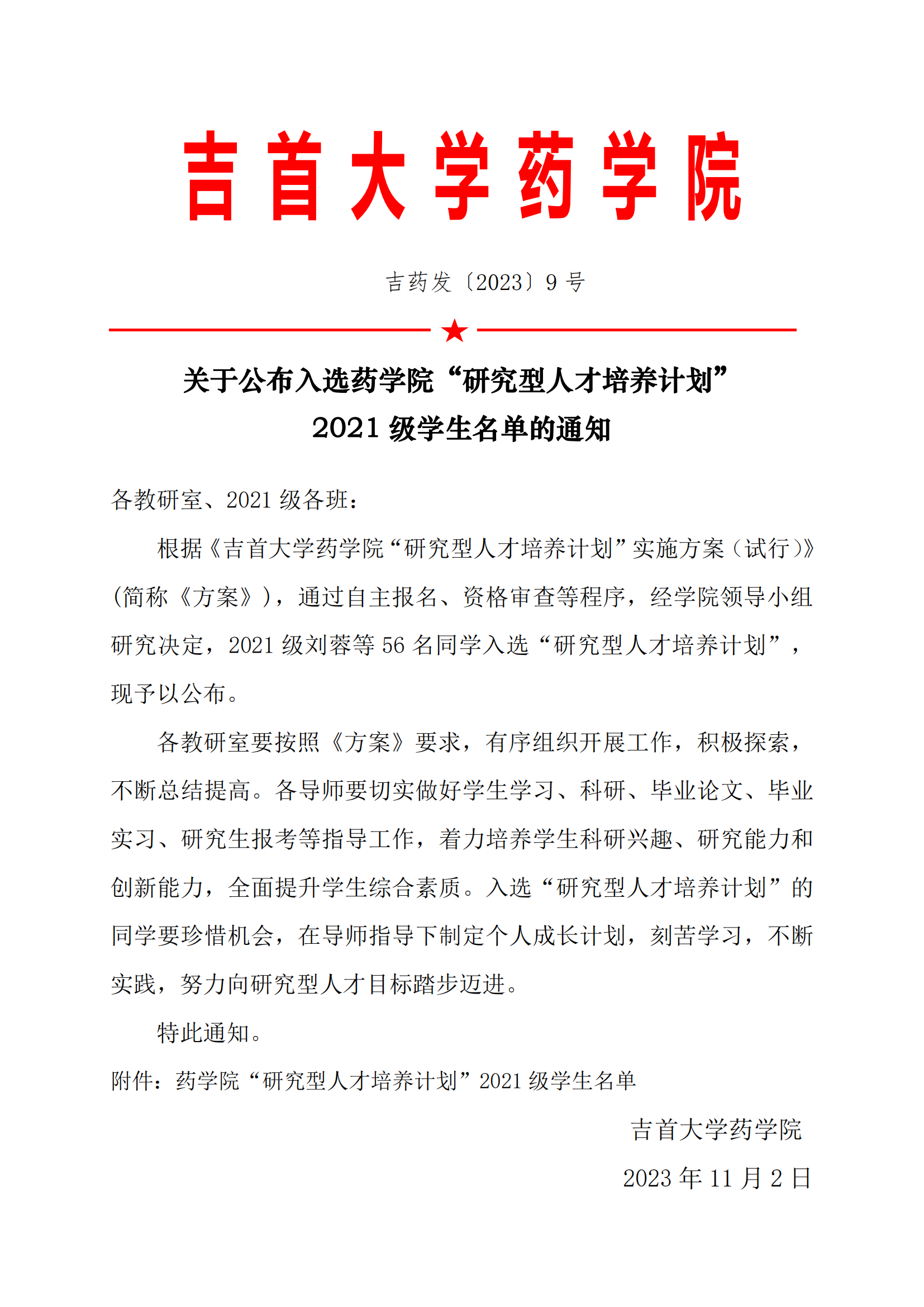 吉药发〔2023〕9号关于公布入选伟德中国官网入口“研究型人才培养计划”2021级员工名单的通知.pdf