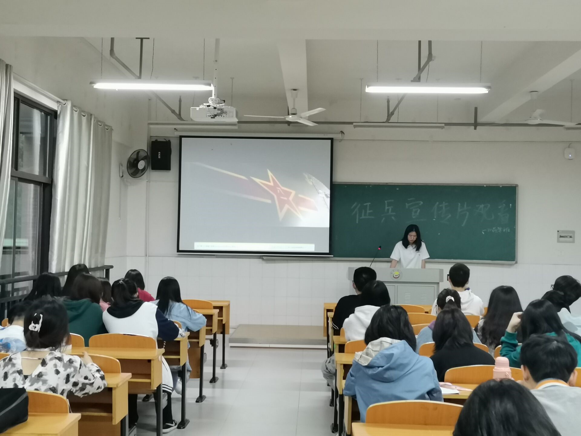 在观看过程中,各班同学全神贯注、聚精会神,从宣传片中认识到了军人保家卫国的责任与担当,体会到了军人吃苦耐劳、甘于奉献的精神,同时,同学们也深深地感受到征兵工作的重要性。