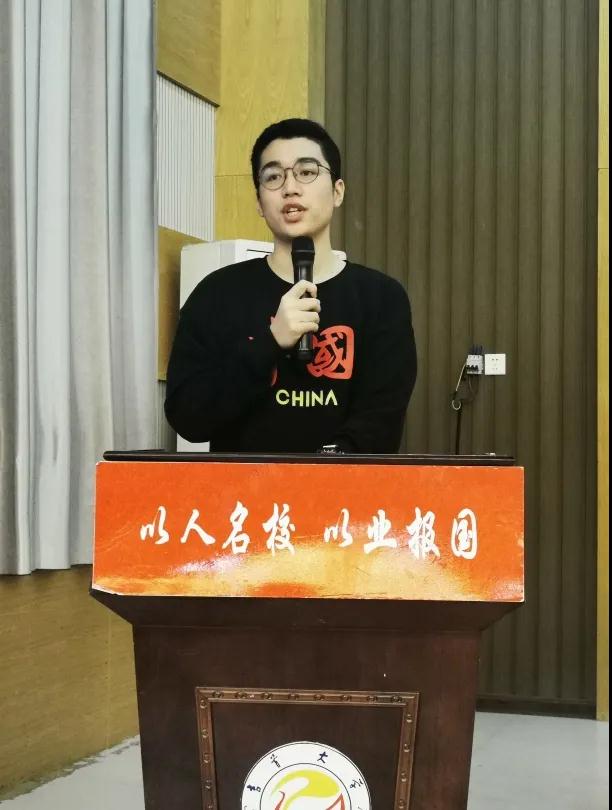 图为 新生代表何先玉同学发言