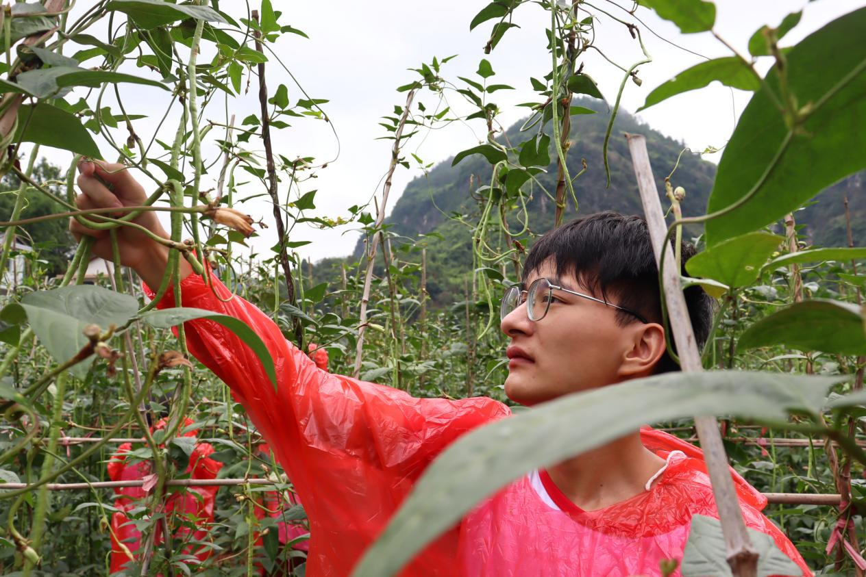 7月,中寨村正值豇豆丰收的季节,豇豆地里一片繁忙和喜悦的氛围。村民们热情地为志愿者们讲解采摘豇豆的方法和技巧。沐浴着阳光,穿梭在豆藤架之间,不一会,一捆捆的豇豆堆得便有小山丘那么高。