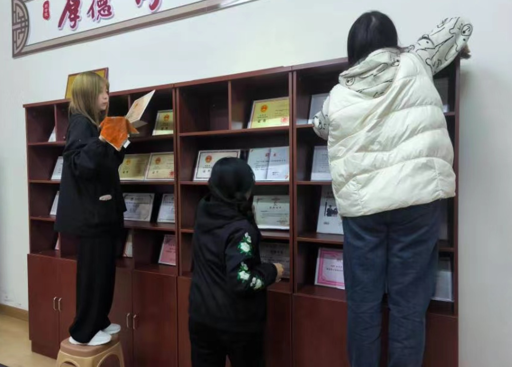 图为 伟德中国官网入口图书室、自习室卫生服务志愿活动志愿者合影