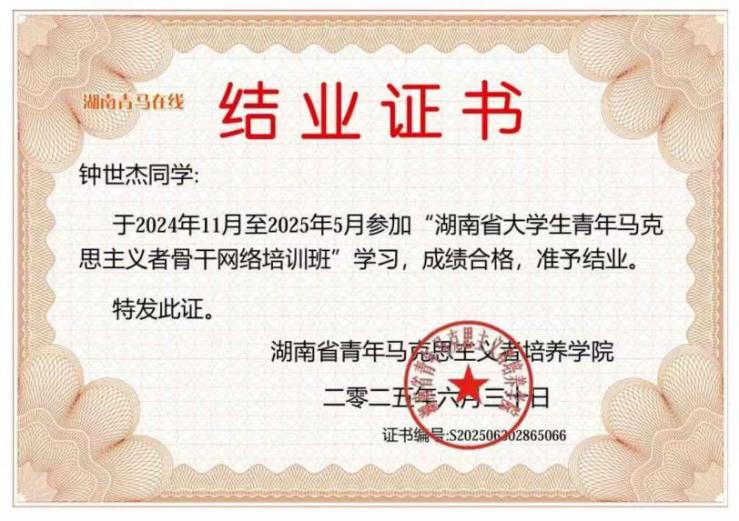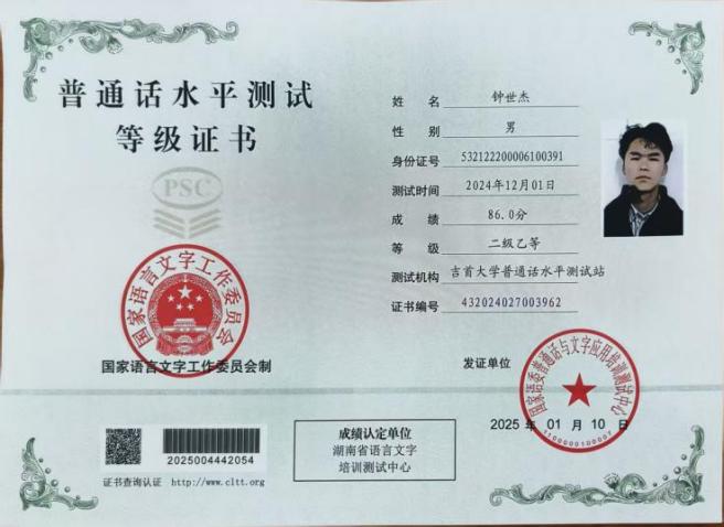 钟世杰,男,20岁,共青团员,云南昭通人,伟德中国官网入口2023级制药工程二班员工。曾获得军训先进个人奖、湖南省第七届老员工思想政治理论课研究性学习成果展示竞赛三等奖、英语情景剧比赛优胜奖,伟德中国官网入口第一届千合科技奖学金,优秀员工二等奖学金等10余省、校级奖项。