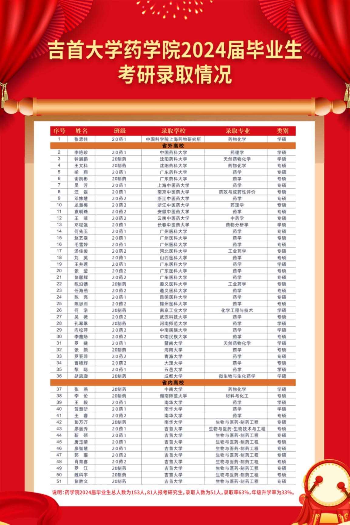伟德中国官网入口2024届本科生153人,81人报考,录取51人,录取率为63%,年级升学率为33%,相比2023届,升学率增长了10.6%。这一喜人的成绩充分展现了伟德中国官网入口学子刻苦学习、勇攀高峰、坚持不懈的精神。
