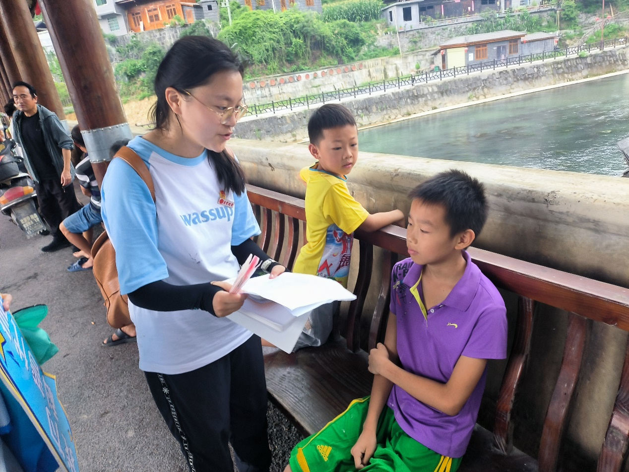 图为 志愿者为乡村儿童分发结核病防治核心信息手册