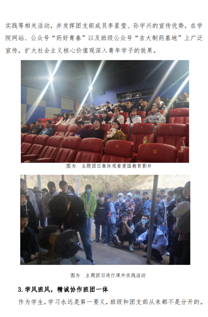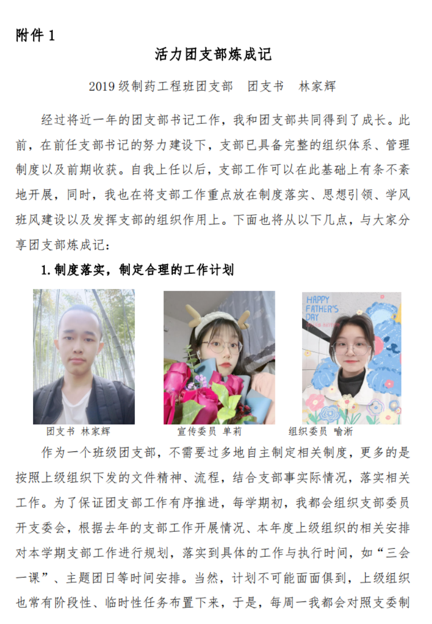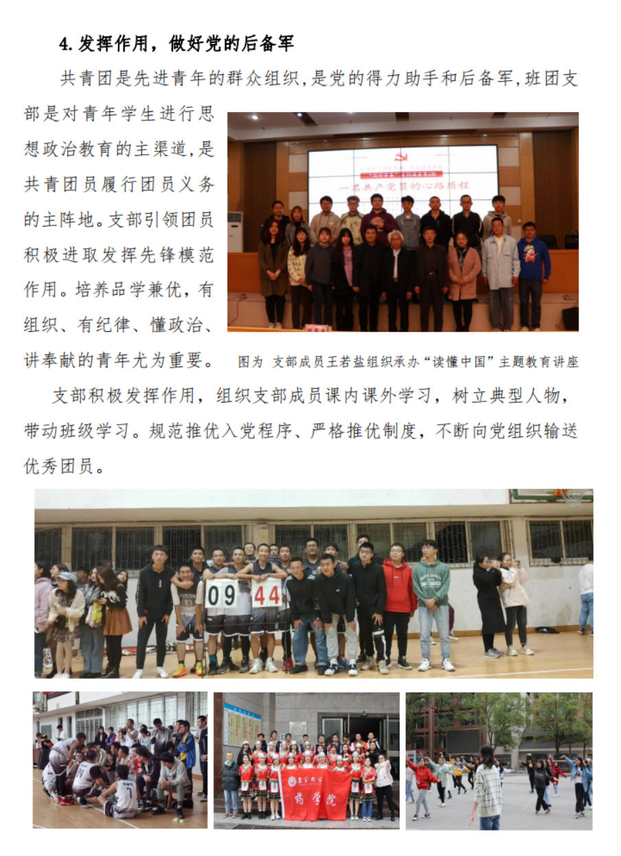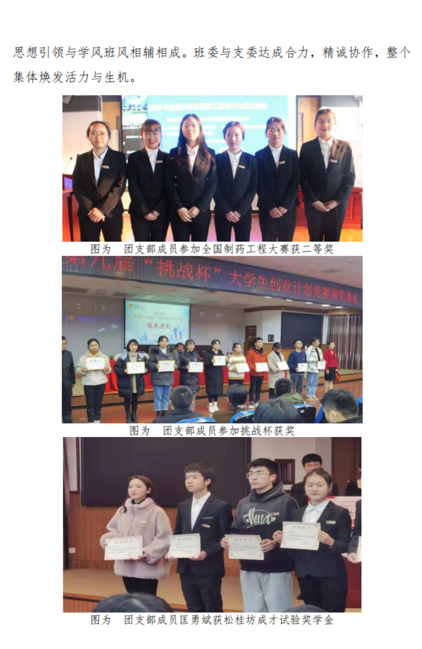 支部团员提交入党申请书比例达97.3%,团支部履行政治功能好,规范组织支部开展思想政治学习,多次主办、承办思想引领、志愿服务、社会实践、体育文化活动。引领团员在学风班风建设中彰显团员先进性,班级到课率为100%,获得“五四”表彰团员5人,树立学习先进典型匡勇斌,获得松桂坊成才试验奖学金、全国老员工制药工程设计大赛三等奖。