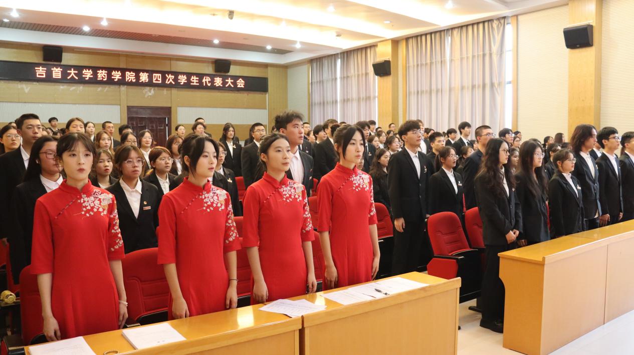 图为 全体起立奏唱国歌