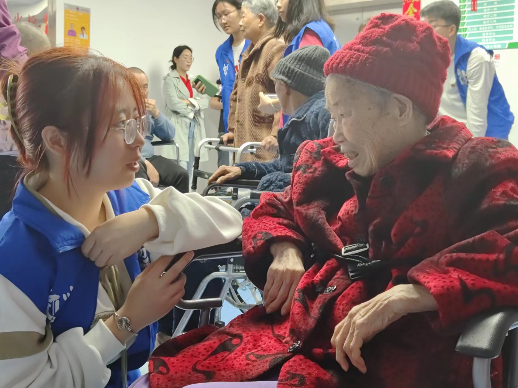 活动当天,志愿者们带着精心准备的礼物早早地来到医养中心,为老人们打扫、整理房间,让老人们居住的环境更加整洁舒适,还与老人们交流互动,认真倾听老人们的心声。镜头拉近,志愿者们帮助一位90岁的婆婆识字、念字,婆婆拉着志愿者的手,说:“你们要努力学习,以后要报效国家、报答党”。老人们的想法是纯粹的,即便只是对学子们的几句叮咛,也想着要为社会做些什么。