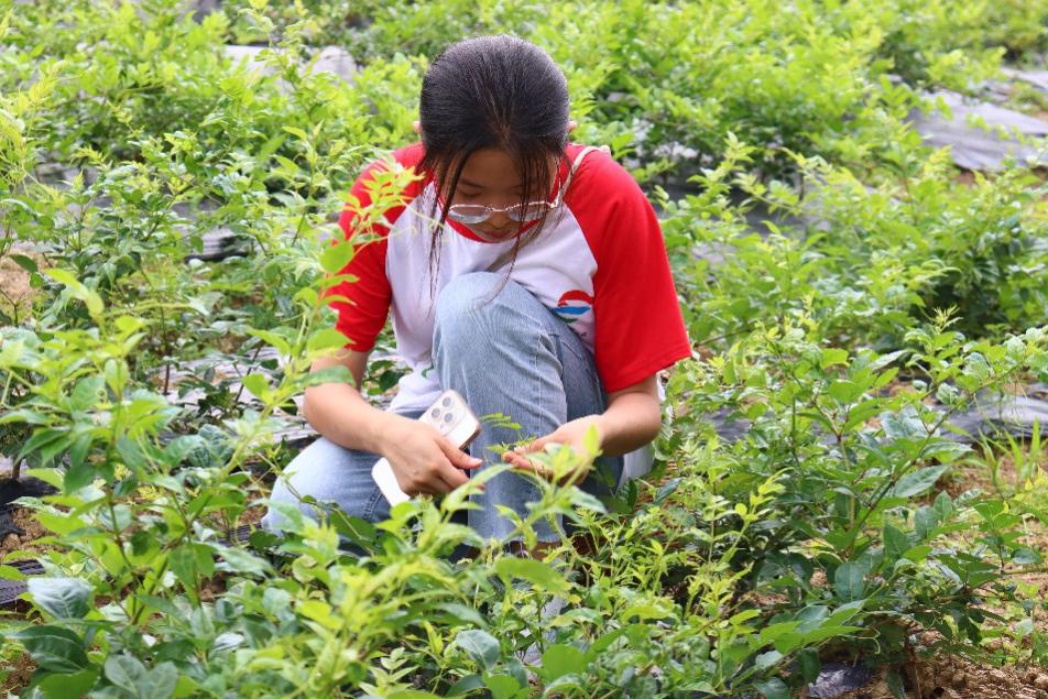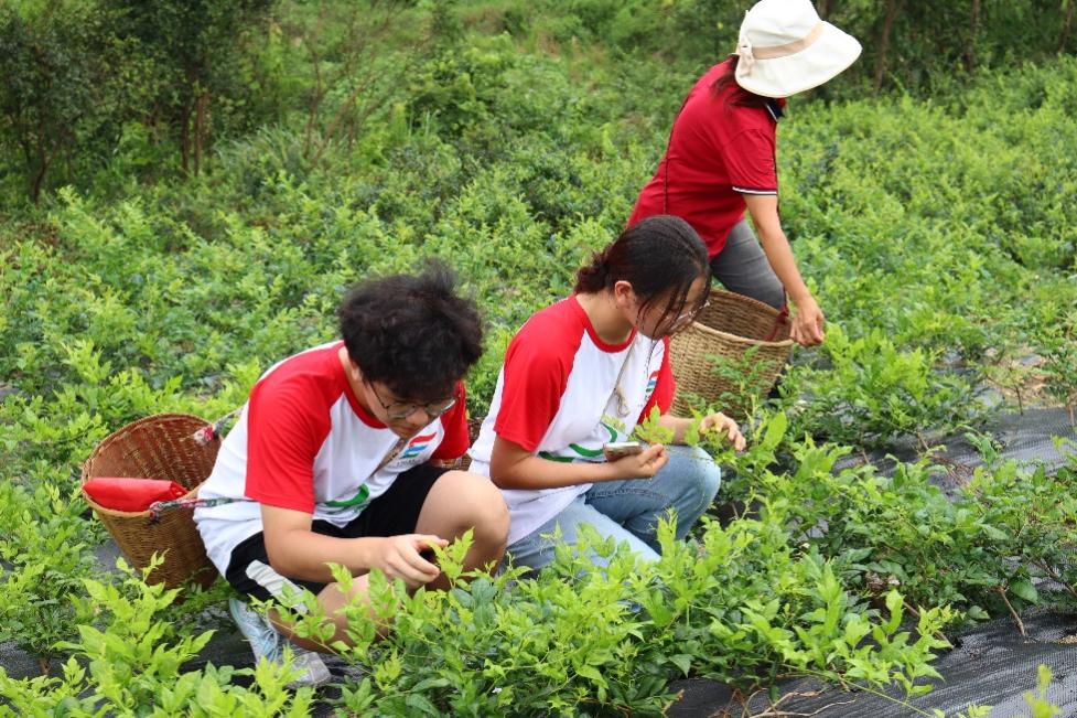 图为 实践队员们近距离体验莓茶的采摘过程