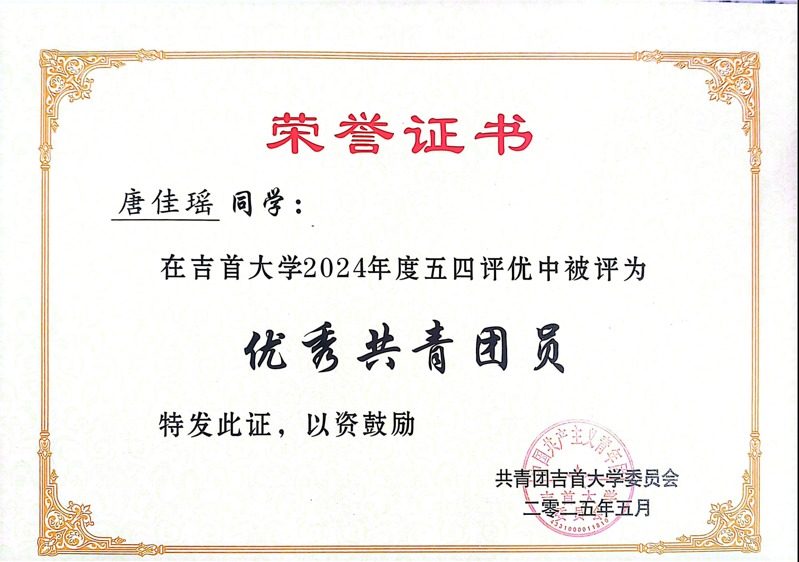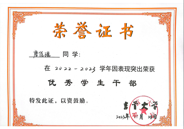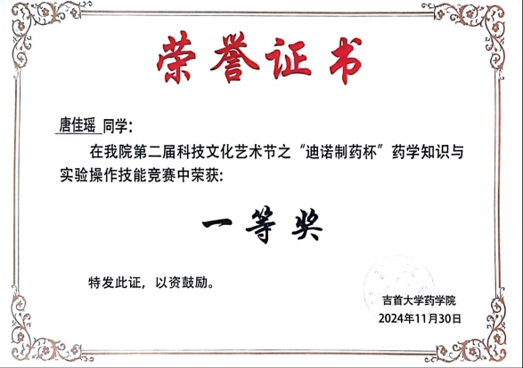 图为 唐佳瑶获奖证书