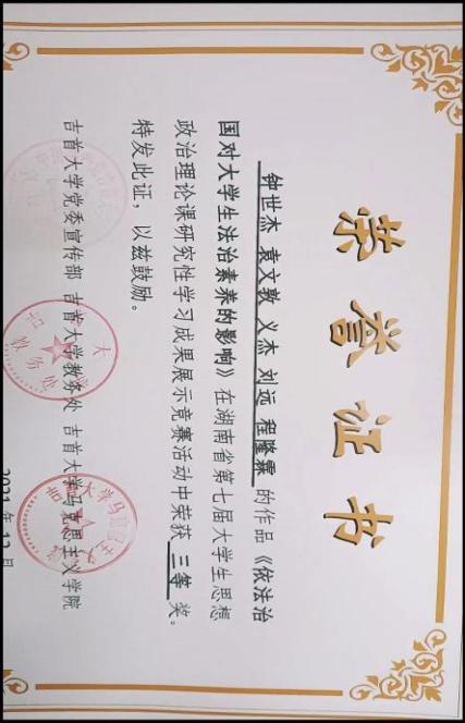 图为 钟世杰获奖证书
