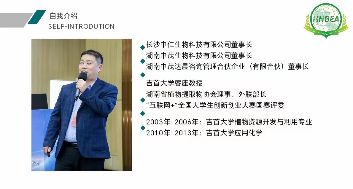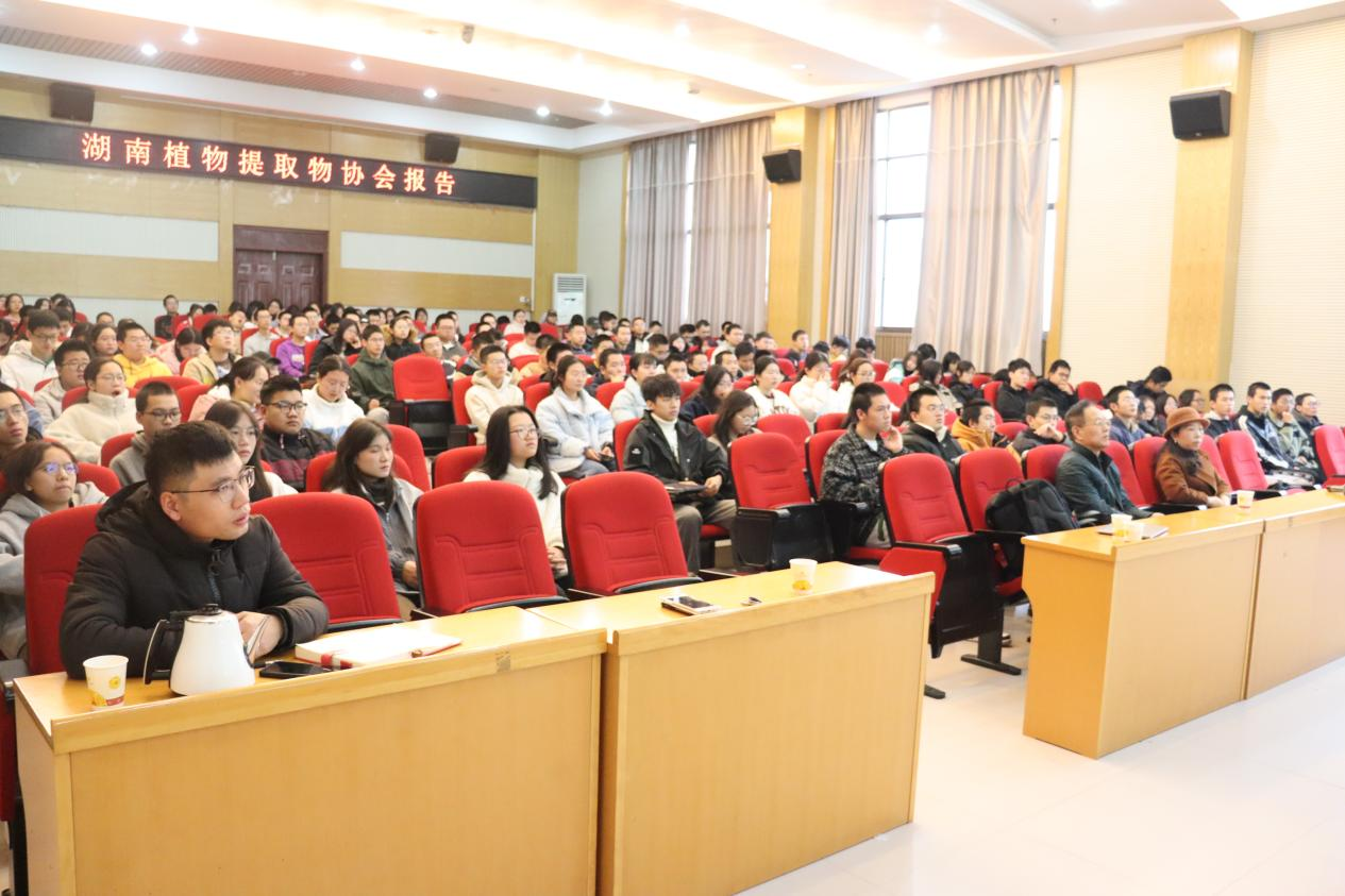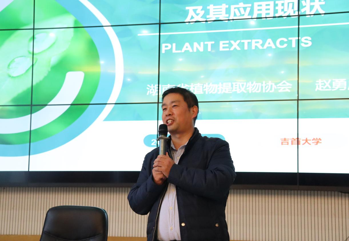 在会议上,赵勇彪董事长从植物提取物的简介、分类和分类依据、在生产生活方面的应用等方面来介绍中国植物提取物产业,让同学们对植物提取物行业有一定的认识。之后,赵勇彪对植物提取物行业发展的现状进行分析,对湖南省植物提取物协会的情况、植提产业的发展趋势及意义进行介绍。他指出植提产业的发展能更好的助力乡村产业振兴,推动中药现代化、国际化进程发展,是一项具有广阔发展前景的行业,值得关注和重视。