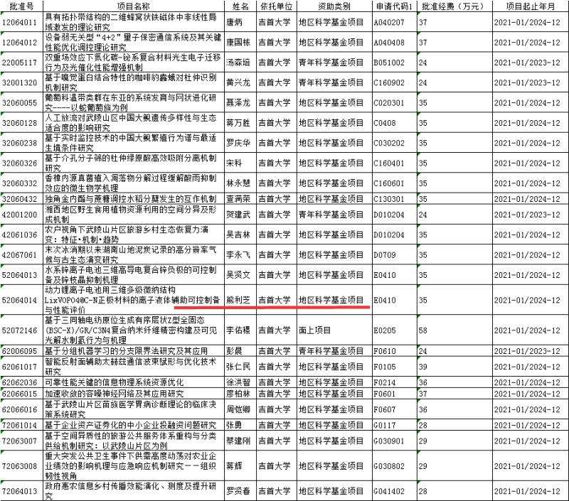 本网讯:(院办供稿) 9月18日,国家自然科学基金委公布了2020年国家自然科学基金项目立项评审结果,公司熊利芝博士、教授申报的国家自然科学基金项目《动力锂离子电池用三维多级维纳结构LixVOP04@C-N正极材料的离子液体辅助可控制备与性能评价》获得立项,资助经费35万元。熊老师治学严谨,潜心科研与教书育人,已主持国家自然科学基金3项,发表学术论文50余篇。
