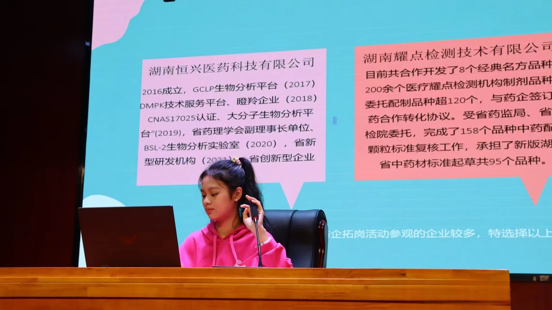 会上,参与分享的同学们分别介绍了所走访的湖南恒兴医药科技有限公司、湖南耀点检测技术有限公司、湖南文谱检测技术有限公司、长沙嘉桥生物科技有限公司(为南通泰禾化工股份有限公司子公司)、湖南慧泽生物医药科技有限公司、长沙晶易医药科技股份有限公司等六家用人单位的企业概况、业务范围、企业优势、企业规模、办公环境、岗位需求、薪资待遇、福利保障、企业文化等信息。